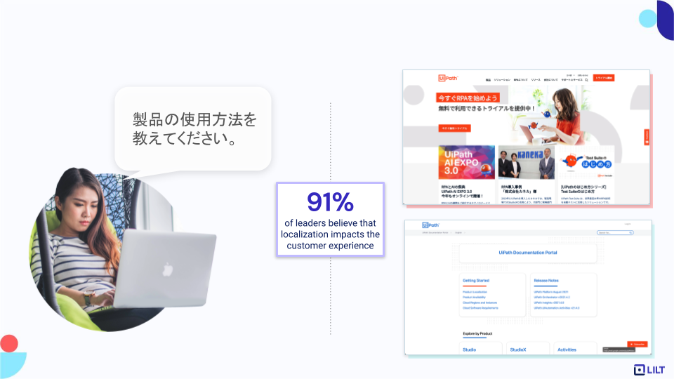 Le nouveau rapport sur l'état de l'expérience mondiale de Lilt révèle que seuls 12 % des points de contact des entreprises avec les clients numériques sont entièrement multilingues Avec 70 % des personnes interrogées déclarant que moins de la moitié de leurs points de contact clients sont multilingues, l'expérience mondiale est fragmentée et nécessite un plus grand soutien de l'entreprise San Francisco, Californie, le 24 mai 2022 - Lilt est la principale plateforme d'expérience mondiale permettant aux entreprises de créer et de proposer des expériences multilingues, annonce aujourd'hui les résultats de son rapport sur l'état de l'expérience mondiale 2022. Avec plus de 1800 réponses de divers services, entreprises et lieux, l'enquête et le rapport visent à saisir les stratégies, les contraintes et les bonnes pratiques de l'expérience et de l'engagement client à l'échelle mondiale.